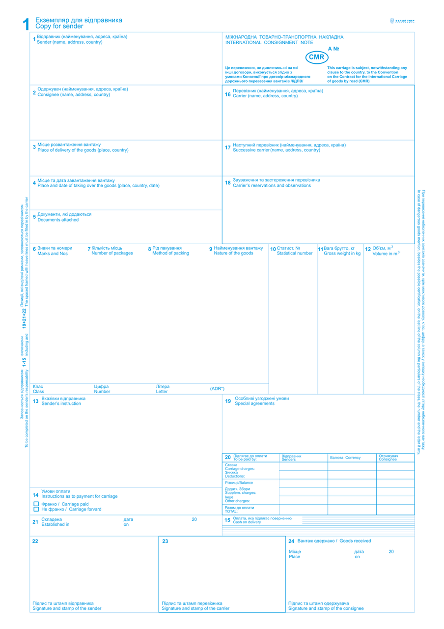 Міжнародна товарно-транспортна накладна - це Бланк формата А4 виготовлений на самокопіювальному папері, комплект з дев’яти аркушів, які мають одну й ту ж саму інформацію, але різняться за кольором тексту. 1 лист - блакитний, 2 лист - зелений, 3 лист - рожевий, інші- чорного кольору текст. Клієнтом заповнюється 1 лист і вся інформація дублюється в комплекті. Без нумерації аркушів.